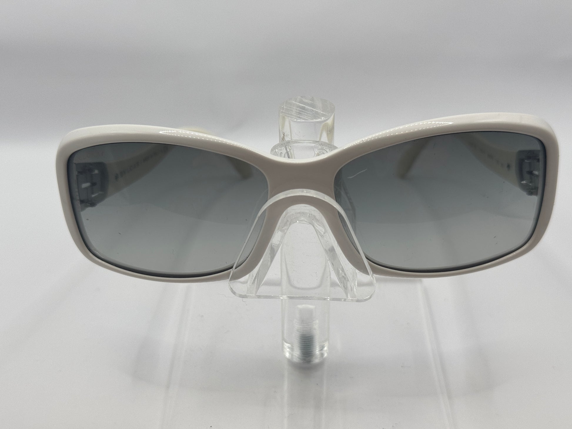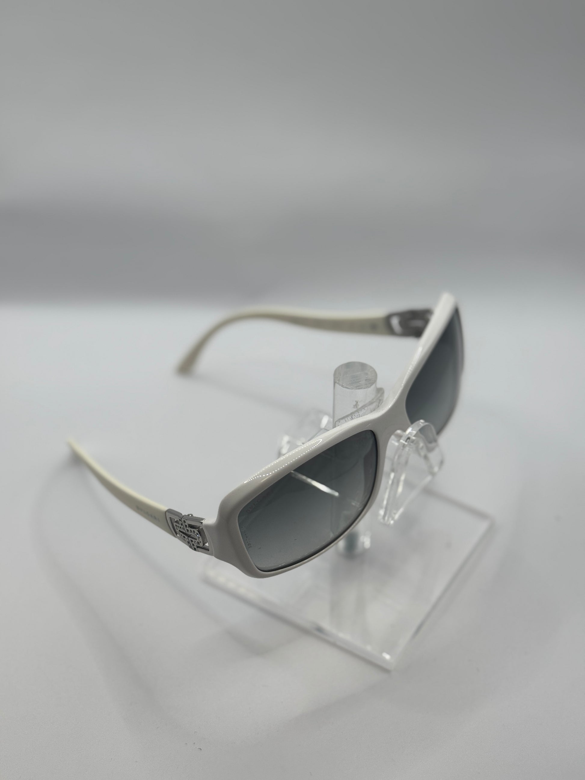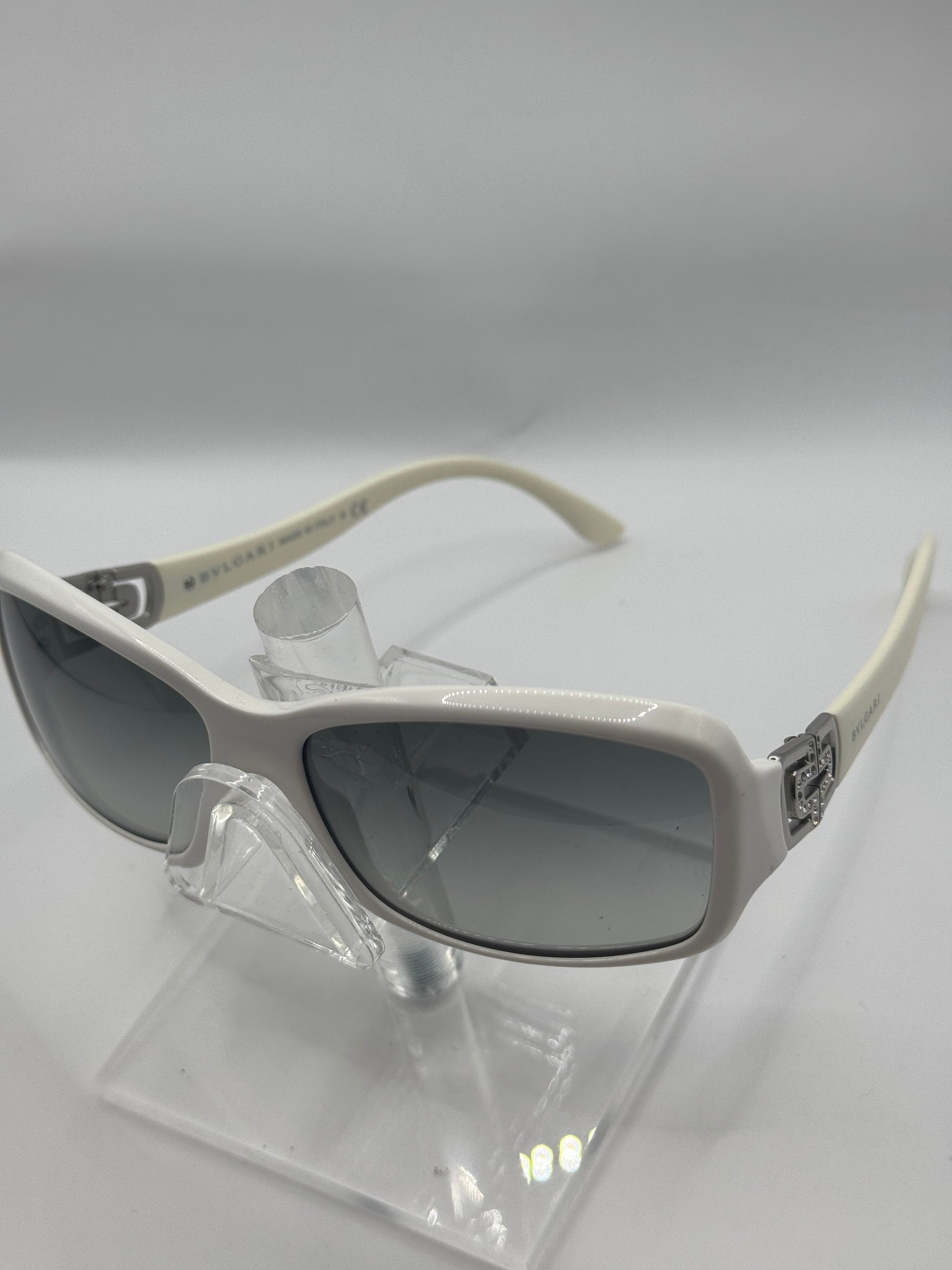 Buy Bvlgari 8021B Sunglasses color code 74011 lens-temple color white-gray gradient in size 56-15-130. A scratch is visible on the left lense .. These glasses are New With Defects.