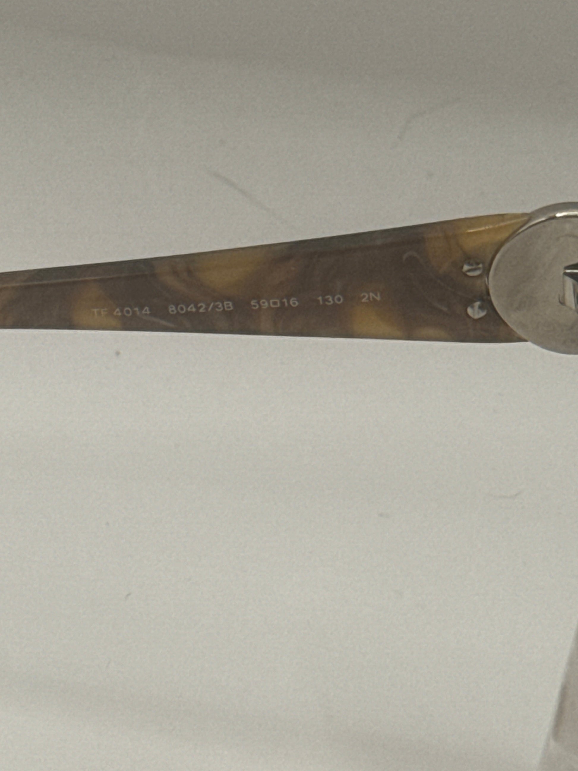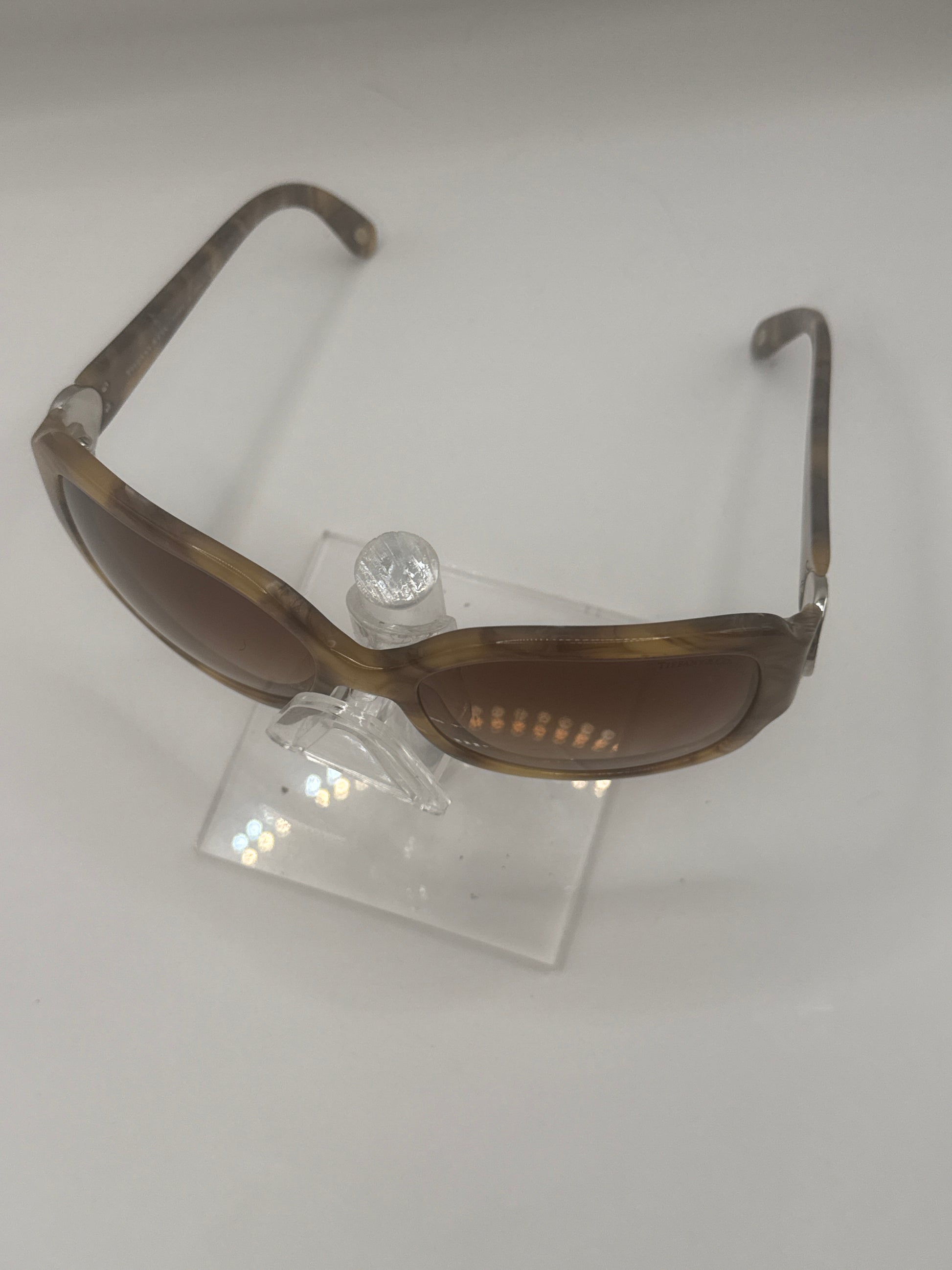 Buy Tiffany 4014 Sunglasses color code 80423B lens-temple color as shown-horn brown gradient in size 59-16-130. Scratches are visible on right lens. These glasses are Pre-Owned.